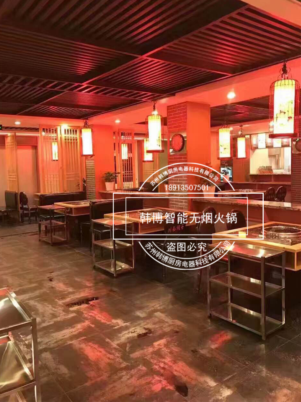 吉立.川西壩子火鍋店剛開(kāi)業(yè)不久,選用韓博智能無(wú)煙火鍋設(shè)備,獨(dú)創(chuàng)凈吸強(qiáng)排技術(shù),油煙吸凈率高達(dá)99%,從源頭杜絕油煙產(chǎn)生,真正為顧客提供舒適愉悅的就餐環(huán)境。韓博科技投入無(wú)煙火鍋、無(wú)煙燒烤已經(jīng)6年時(shí)間,積累了豐富的行業(yè)經(jīng)驗(yàn),無(wú)論是生產(chǎn)能力還是研發(fā)能力都是行業(yè)領(lǐng)先。目前已與火鍋行業(yè)5000余家火鍋店展開(kāi)了合作,客戶遍布全國(guó)!